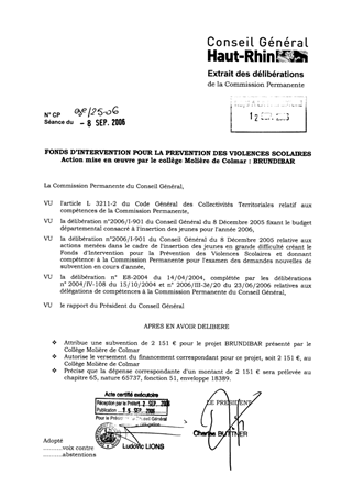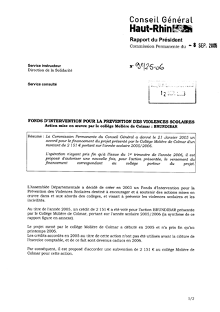 Fonds d'intervention pour la prévention des violences scolaires - action mise en œuvre par le collège Molière de COLMAR: BRUNDIBAR