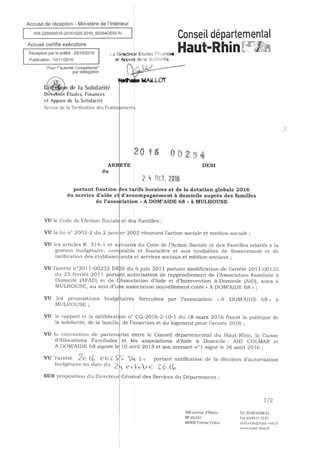 portant fixation des tarifs horaires et de la dotation globale 2016 du service d'aide et d'accompagnement à domicile auprès des familles de l'associaton "A DOM'AIDE 68" à MULHOUSE Resumé Pièces jointes ARRETE Assemblée : Non défini Date : 24/10/2016 Rapporteur : Non défini Collectivité : Conseil départemental du Haut-Rhin Direction : Non défini Service : Direction Etudes, Finances et Appuis de la Solidarité Domaine : Dotations financières Commission :