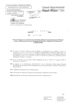 portant fixation du montant de la dotation globale de fonctionnement 2016 du centre d'hébergement et de réadaptation sociale "Solidarités Femmes 68" à SAINT-LOUIS Resumé Pièces jointes ARRETE Assemblée : Non défini Date : 28/10/2016 Rapporteur : Non défini Collectivité : Conseil départemental du Haut-Rhin Direction : Non défini Service : Direction Etudes, Finances et Appuis de la Solidarité Domaine : Dotations financières Commission :
