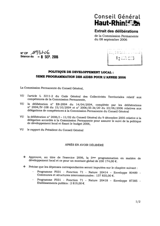 Programmation définitive, au titre de l’exercice 2006, des opérations de développement local telles qu’elles figurent en annexes 1 et 2 du rapport pour un montant global de 230 174,00 euros.