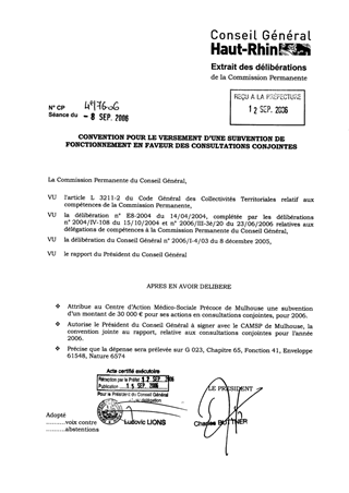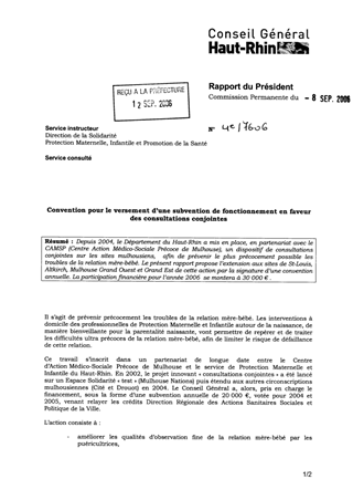 Depuis 2004, le Département du Haut-Rhin a mis en place, en partenariat avec le CAMSP (Centre d’Action Médico-Sociale Précoce de Mulhouse), un dispositif de consultations conjointes sur les sites mulhousiens, afin de prévenir le plus précocement possible les troubles de la relation mère bébé. Le présent rapport propose l’extension aux sites de St-Louis, Altkirch, Mulhouse Grand Ouest et Grand Est de cette action par la signature d’une convention annuelle. La participation financière pour l’année 2006 se montera à 30 000 € .
