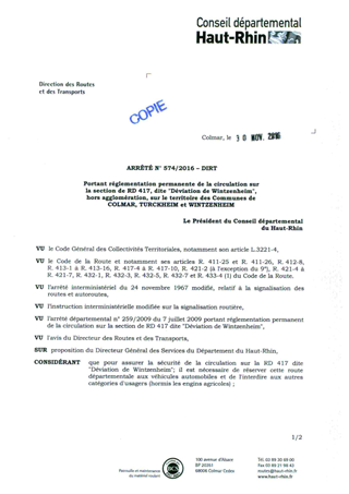 portant réglementation permanente de la circulation sur la section de RD 417, dite "déviation de Wintzenheim", hors agglomération, sur le territoire des communes de COLMAR, TURCKHEIM et WINTZENHEIM Resumé Pièces jointes ARRETE Assemblée : Non défini Date : 30/11/2016 Rapporteur : Non défini Collectivité : Conseil départemental du Haut-Rhin Direction : Non défini Service : Direction des Routes Domaine : Circulation Commission :