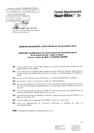 portant modification de l'autorisation de fonctionnement de la micro-crèche "Jules et Rose", sis au 1 route de Bâle à COLMAR (68000) Resumé Pièces jointes ARRETE Assemblée : Non défini Date : 30/11/2016 Rapporteur : Non défini Collectivité : Conseil départemental du Haut-Rhin Direction : Non défini Service : Direction Enfance Santé Insertion Domaine : Accueil d'enfants Commission :