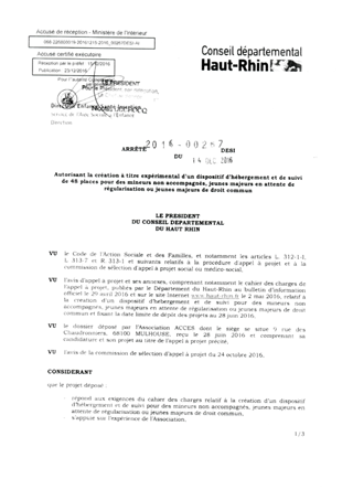 autorisant la création à titre expérimental d'un dispositif d'hébergement et de suivi de 48 places pour des mineurs non accompagnés, jeunes majeurs en attente de régularisation ou jeunes majeurs de droit commun Resumé Pièces jointes ARRETE Assemblée : Non défini Date : 14/12/2016 Rapporteur : Non défini Collectivité : Conseil départemental du Haut-Rhin Direction : Non défini Service : Direction Enfance Santé Insertion Domaine : Autres (non classés) Commission :