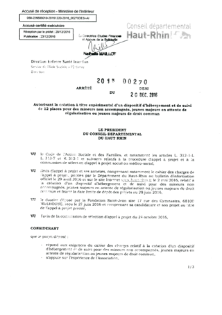 autorisant la création à titre expérimental d'un dispositif d'hébergement et de suivi de 12 places pour des mineurs non accompagnés, jeunes majeurs en attente de régularisation ou jeunes majeurs de droit commun Resumé Pièces jointes ARRETE Assemblée : Non défini Date : 20/12/2016 Rapporteur : Non défini Collectivité : Conseil départemental du Haut-Rhin Direction : Non défini Service : Direction Enfance Santé Insertion Domaine : Autres (non classés) Commission :