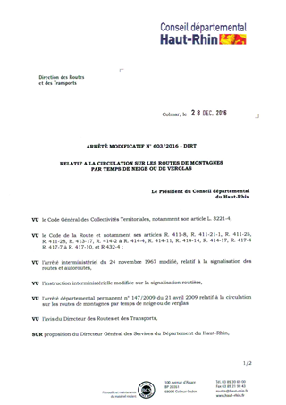 Arrêté modificatif n° 603-2016 DIRT relatif à la circulation sur les routes de montagnes par temps de neige ou de verglas Resumé Pièces jointes ARRETE Assemblée : Non défini Date : 28/12/2016 Rapporteur : Non défini Collectivité : Conseil départemental du Haut-Rhin Direction : Non défini Service : Direction des Routes Domaine : Organisation Interne Commission :
