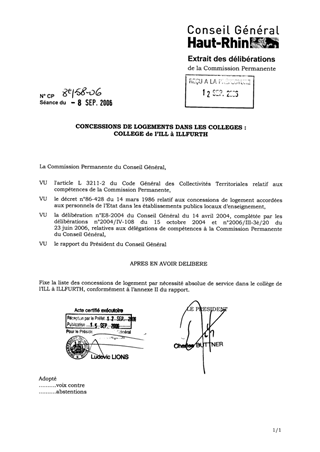 Ce rapport a pour objet de soumettre à la Commission Permanente une nouvelle répartition des concessions de logement par nécessité absolue de service au collège de l’ILL à ILLFURTH.