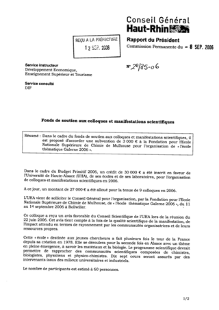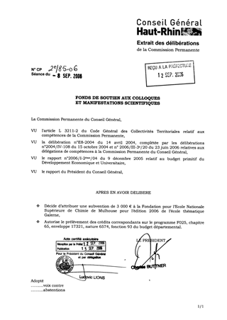 Dans le cadre du fonds de soutien aux colloques et manifestations scientifiques, il est proposé d’accorder une subvention de 3 000 € à la Fondation pour l’Ecole Nationale Supérieure de Chimie de Mulhouse pour l’organisation de « l’école thématique Galerne 2006 ».