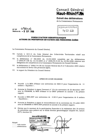 Pour l’année 2006, il est proposé de reconduire les actions de prévention des chutes en faveur des personnes âgées et de renouveler la convention de partenariat avec l'Institut Régional pour la Formation des Adultes (I.R.F.A. EST) chargé de la mise en œuvre des ateliers » Equilibre » dans le cadre des pôles gérontologiques