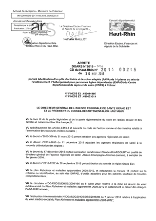 Arrêté DGARS N° 2016-3099 CD du Haut-Rhin n° 2016-00265 du 30 novembre 2016 Resumé Pièces jointes ARRETE Assemblée : Non défini Date : 06/01/2017 Rapporteur : Non défini Collectivité : Conseil départemental du Haut-Rhin Direction : Non défini Service : Direction de la Solidarité Domaine : Autres (non classés) Commission :