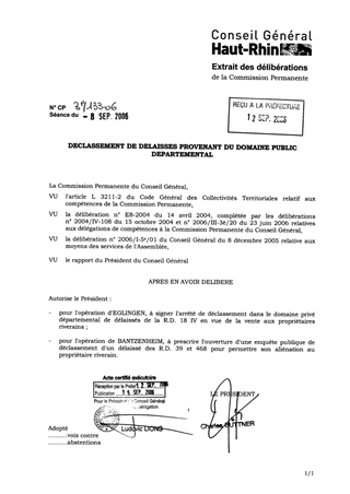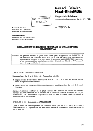 Le présent rapport a pour objet d'une part, d'approuver à EGLINGEN, le déclassement de délaissés de la R.D. 18 IV pour permettre leur aliénation aux propriétaires riverains et d'autre part, de prescrire à BANTZENHEIM, l'ouverture d'une enquête publique de déclassement d'un délaissé des R.D. 39 et 468 en vue de sa vente au propriétaire riverain.