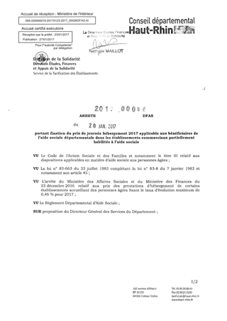 Arrêté 2017-00006 DFAS portant fixation du prix de journée hébergement 2017 applicable aux bénéficiaires de l'aide sociale départementale dans les établissements commerciaux partiellement habilités à l'aide sociale Resumé Pièces jointes ARRETE Assemblée : Non défini Date : 20/01/2017 Rapporteur : Non défini Collectivité : Conseil départemental du Haut-Rhin Direction : Non défini Service : Direction de la Solidarité Domaine : Prix de Journée Commission :
