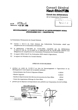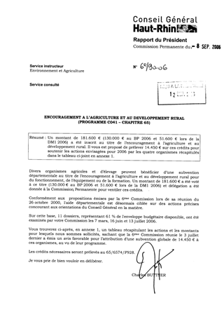 Un montant de 181.600 € (130.000 € au BP 2006 et 51.600 € lors de la DM1 2006) a été inscrit au titre de l’encouragement à l’agriculture et au développement rural. Il vous est proposé de prélever 14.450 € sur ces crédits pour soutenir les actions envisagées pour 2006 par les quatre organismes récapitulés dans le tableau ci-joint en annexe 1.