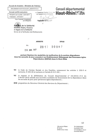 Arrêté 2017-00007 DFAS portant fixation des modalités de tarification de la section dépendance dans les accueils de jour annexés à un Etablissement Hébergeant des Personnes Agées Dépendantes (EHPAD) dans le Haut-Rhin Resumé Pièces jointes ARRETE Assemblée : Non défini Date : 20/01/2017 Rapporteur : Non défini Collectivité : Conseil départemental du Haut-Rhin Direction : Non défini Service : Direction de la Solidarité Domaine : Personnes Agées Commission :
