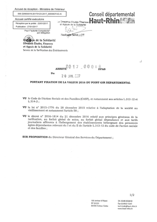 Arrêté 2017-00008 DFAS portant fixation de la valeur 2016 du point GIR Départemental Resumé Pièces jointes ARRETE Assemblée : Non défini Date : 20/01/2017 Rapporteur : Non défini Collectivité : Conseil départemental du Haut-Rhin Direction : Non défini Service : Direction de la Solidarité Domaine : Personnes Agées Commission :