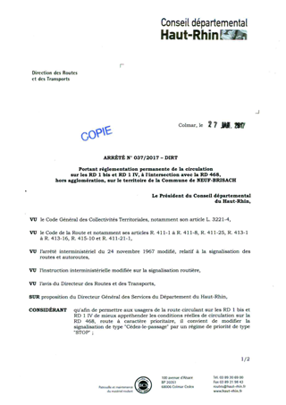 Arrêté 2017-00037 DIRT portant réglementation permanente de la circulation sur les RD 1 bis et RD 1 IV à l'intersection avec la RD 468 hors agglomération, sur le territoire de la commune de NEUF-BRISACH Resumé Pièces jointes ARRETE Assemblée : Non défini Date : 27/01/2017 Rapporteur : Non défini Collectivité : Conseil départemental du Haut-Rhin Direction : Non défini Service : Direction des Routes Domaine : Circulation Commission :