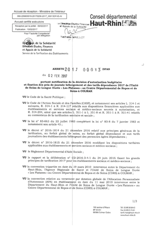Arrêté 2017-00013-DFAS portant fixation du tarif journalier et des tarifs dépendances 2017 de l'Unité de Soins de Longue Durée "Les Platanes" CDRS à COLMAR Resumé Pièces jointes ARRETE Assemblée : Non défini Date : 02/02/2017 Rapporteur : Non défini Collectivité : Conseil départemental du Haut-Rhin Direction : Non défini Service : Direction de la Solidarité Domaine : Prix de Journée Commission :