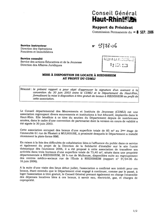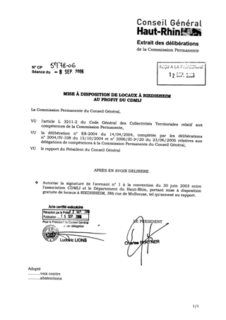 Mise à disposition de locaux à RIEDISHEIM au profit du CDMIJ Resumé Pièces jointes DELIBERATION RAPPORT Assemblée : Commission Permanente Date : 08/09/2006 Rapporteur : Non défini Collectivité : Conseil départemental du Haut-Rhin Direction : Non défini Service : Service du Patrimoine et du droit des Sols Domaine : Marchés publics Commission : Commission Permanente