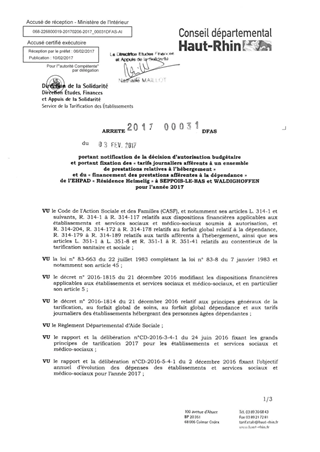 Arrêté 2017-00031-DFAS portant notification fixation des tarifs journaliers et des tarifs dépendances année 2017 EHPAD "Résidence Heimelig à SEPPOIS-LE-BAS et WALDIGHOFFEN Resumé Pièces jointes ARRETE Assemblée : Non défini Date : 03/02/2017 Rapporteur : Non défini Collectivité : Conseil départemental du Haut-Rhin Direction : Non défini Service : Direction de la Solidarité Domaine : Prix de Journée Commission :
