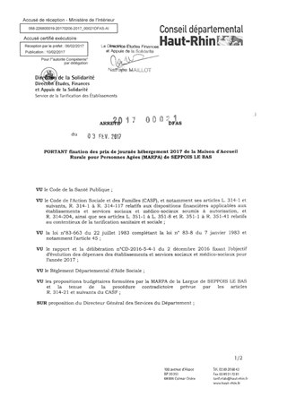 Arrêté 2017-00021-DFAS portant fixation des prix de journée hébergement 2017 de la Maison d'Accueil Rurale pour Personnes Agées de SEPPOIS LE BAS Resumé Pièces jointes ARRETE Assemblée : Non défini Date : 03/02/2017 Rapporteur : Non défini Collectivité : Conseil départemental du Haut-Rhin Direction : Non défini Service : Direction de la Solidarité Domaine : Prix de Journée Commission :