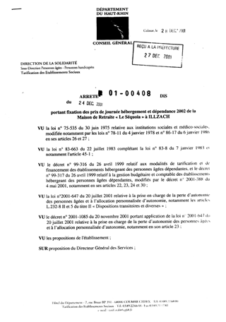 Portant fixation des prix de journée hébergement et dépendance 2002 de la Maison de Retraite "Le Séquoia" à ILLZACH Resumé Pièces jointes ARRETE Assemblée : Non défini Date : 24/12/2001 Rapporteur : Non défini Collectivité : Conseil départemental du Haut-Rhin Direction : Non défini Service : Direction de la Solidarité Domaine : Prix de Journée Commission :