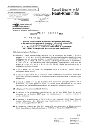 Arrêté 2017-00016-DFAS portant notification fixation des tarifs journaliers et du financement prestations afférentes à la dépendance EHPAD de l'Hôpital de RIBEAUVILLE année 2017 Resumé Pièces jointes ARRETE Assemblée : Non défini Date : 03/02/2017 Rapporteur : Non défini Collectivité : Conseil départemental du Haut-Rhin Direction : Non défini Service : Direction de la Solidarité Domaine : Prix de Journée Commission :