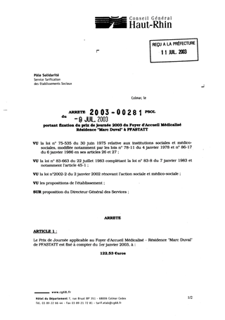 portant fixation du prix de journée 2003 du foyer d'accueil médicalisé résidence "Marc Duval" à PFASTATT. Resumé Pièces jointes ARRETE Assemblée : Non défini Date : 09/07/2003 Rapporteur : Non défini Collectivité : Conseil départemental du Haut-Rhin Direction : Non défini Service : Service de la Tarification des Etablissements Domaine : Prix de Journée Commission :