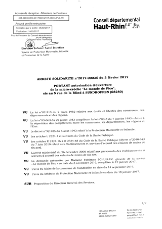 Arrêté 2017-00035 du 3 février 2017 portant autorisation d'ouverture de la micro-crèche "Le monde de Pico" sis au 5 rue de la Blind à 68280 SUNDSHOFFEN Resumé Pièces jointes ARRETE Assemblée : Non défini Date : 03/02/2017 Rapporteur : Non défini Collectivité : Conseil départemental du Haut-Rhin Direction : Non défini Service : Direction de la Solidarité Domaine : Accueil d'enfants Commission :