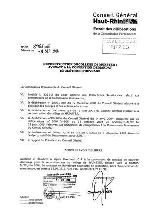Le présent rapport a pour objet la passation d’un avenant à la convention de mandat de maîtrise d’ouvrage pour la reconstruction achevée du collège de MUNSTER compte tenu de la révision de prix des travaux. Cet avenant fait suite à l’inscription d’une AP supplémentaire, en DM1 2006, de 106.900 €.