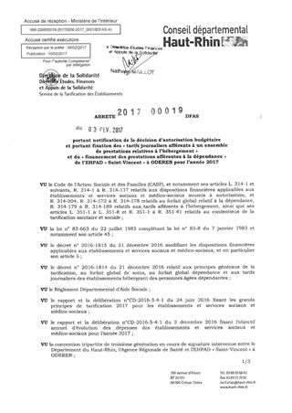 Arrêté 2017-00019-DFAS portant notification fixation des tarifs journaliers et des tarifs dépendances année 2017 EHPAD St-Vincent à ODEREN Resumé Pièces jointes ARRETE Assemblée : Non défini Date : 03/02/2017 Rapporteur : Non défini Collectivité : Conseil départemental du Haut-Rhin Direction : Non défini Service : Direction de la Solidarité Domaine : Prix de Journée Commission :