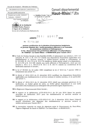 Arrêté 2017-00027-DFAS portant notification fixation des tarifs journaliers et des tarifs dépendances année 2017 EHPAD "Le Castel Blanc" à MASEVAUX Resumé Pièces jointes ARRETE Assemblée : Non défini Date : 03/02/2017 Rapporteur : Non défini Collectivité : Conseil départemental du Haut-Rhin Direction : Non défini Service : Direction de la Solidarité Domaine : Prix de Journée Commission :