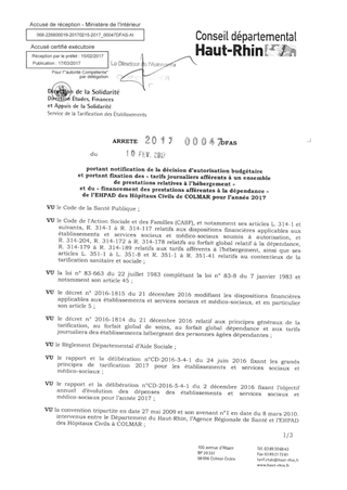 portant notification de la décision d'autorisation budgétaire et portant fixation des "tarifs journaliers afférents à un ensemble de prestations relatives à l'hébergement" et du "financement des prestations afférentes à la dépendance" de l'EHPAD des hôpit
