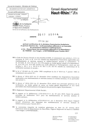 portant notification de la décision d'autorisation budgétaire et portant fixation des "tarifs journaliers afférents à un ensemble de prestations relatives à l'hébergement" et du "financement des prestations afférentes à la dépendance" de l'EHPAD "Les Vosg