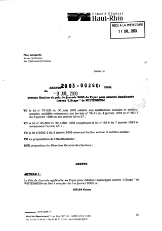 portant fixation du prix de journée 2003 du foyer pour adultes handicapés graves "L'Etape" de WITTENHEIM. Resumé Pièces jointes ARRETE Assemblée : Non défini Date : 09/07/2003 Rapporteur : Non défini Collectivité : Conseil départemental du Haut-Rhin Direction : Non défini Service : Service de la Tarification des Etablissements Domaine : Prix de Journée Commission :