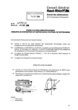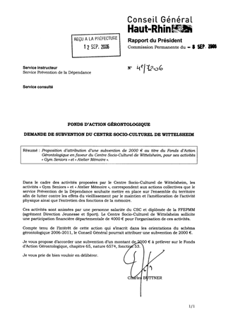Fonds d'action gérontologique. Demande de subvention du centre socio-culturel de Wittelsheim