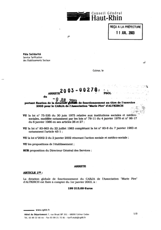 portant fixation de la dotation globale de fonctionnement au titre de l'exercice 2003 pour le CARJA de l'Association "Marie Pire" d'ALTKIRCH. Resumé Pièces jointes ARRETE Assemblée : Non défini Date : 09/07/2003 Rapporteur : Non défini Collectivité : Conseil départemental du Haut-Rhin Direction : Non défini Service : Service de la Tarification des Etablissements Domaine : Dotations financières Commission :