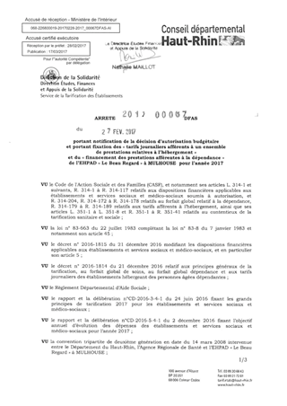 portant notification de la décision d'autorisation budgétaire et portant fixation des "tarifs journaliers afférents à un ensemble de prestations relatives à l'hébergement" et du "financement des prestations afférentes à la dépendance" de l'EHPAD "Le Beau