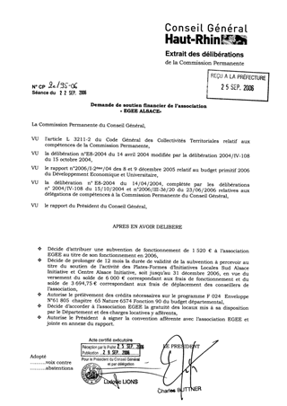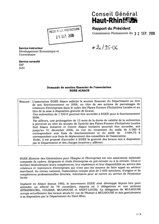 L’association EGEE Alsace sollicite le soutien financier du Département au titre de son fonctionnement en 2006, au titre de ses actions de parrainages de créateurs d’entreprises dans le cadre des Plates-Formes d’Initiatives Locales et au titre de la mise à disposition gratuite de locaux. Une subvention de 1 520 € pourrait être accordée à EGEE pour le fonctionnement 2006. Par ailleurs, une prolongation de 12 mois de la durée de validité de la subvention à percevoir au titre du soutien de l’activité des Plates-Formes d’Initiatives Locales Sud Alsace Initiative et Centre Alsace Initiative pourrait être accordée, soit jusqu’au 31 décembre 2006, en vue du versement du solde de 6 000 € correspondant aux frais de fonctionnement et du solde de 3 694,75 € correspondant aux frais de déplacement des conseillers de l’association. Enfin, il est proposé d’accorder à EGEE la gratuité des locaux mis à disposition par le Département et des charges locatives y afférent.