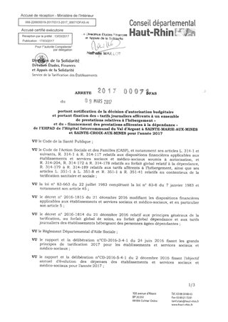 portant notification de la décision d'autorisation budgétaire et portant fixation des "tarifs journaliers afférents à un ensemble de prestations relative à l'hébergement" et du "financement des prestations afférentes à la dépendance" de l'EHPAD de l'hôpit