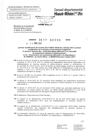 portant modification de l'arrêté 2017-00027-DFAS du 3 février 2017 portant notification de la décision d'autorisation budgétaire et portant fixation des "tarifs journaliers afférents à un ensemble de prestations relatives à l'hébergement" et du "financeme
