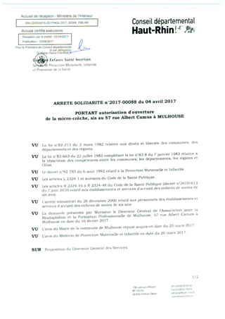 portant autorisation d'ouverture de la micro-crèche, sis au 57 rue Albert Camus à MULHOUSE Resumé Pièces jointes ARRETE Assemblée : Non défini Date : 04/04/2017 Rapporteur : Non défini Collectivité : Conseil départemental du Haut-Rhin Direction : Non défini Service : Direction Enfance Santé Insertion Domaine : Accueil d'enfants Commission :