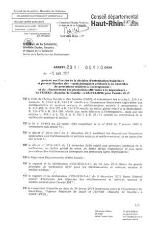 portant notification de la décision d'autorisation budgétaire et portant fixation des "tarifs journaliers afférents à un ensemble de prestations relatives à l'hébergement" et du "financement des prestations afférentes à la dépendance" de l'EHPAD "Blanche