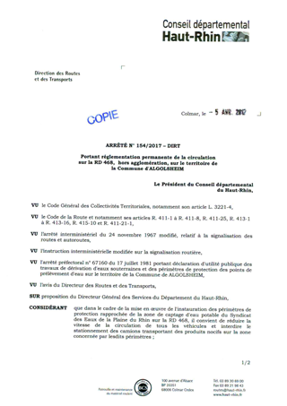 portant réglementation permanente de la circulation sur le RD 468, hors agglomération, sur le territoire de la commune d'ALGOLSHEIM Resumé Pièces jointes ARRETE Assemblée : Non défini Date : 05/04/2017 Rapporteur : Non défini Collectivité : Conseil départemental du Haut-Rhin Direction : Non défini Service : Direction des Routes Domaine : Circulation Commission :