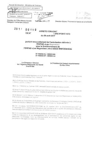 portant renouvellement de l'autorisation délivrée à l'EHPAD "Les Magnolias" pour le fonctionnement de l'EHPAD "Les Magnolias" sis à 68920 WINTZENHEIM Resumé Pièces jointes ARRETE Assemblée : Non défini Date : 06/04/2017 Rapporteur : Non défini Collectivité : Conseil départemental du Haut-Rhin Direction : Non défini Service : Direction Etudes, Finances et Appuis de la Solidarité Domaine : Autres (non classés) Commission :