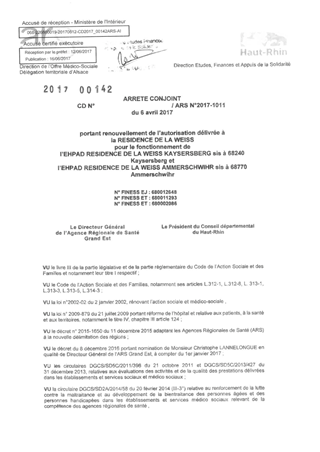 portant renouvellement de l'autorisation délivrée à la résidence de la Weiss pour le fonctionnement de l'EHPAD Résidence de la Weiss KAYSERSBERG sis à 68240 KAYSERSBERG et l'EHPAD Résidence de la Weiss AMMERSCHWIHR sis à 68770 AMMERSCHWIHR Resumé Pièces jointes ARRETE Assemblée : Non défini Date : 06/04/2017 Rapporteur : Non défini Collectivité : Conseil départemental du Haut-Rhin Direction : Non défini Service : Direction Etudes, Finances et Appuis de la Solidarité Domaine : Autres (non classés) Commission :