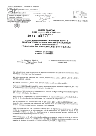 portant renouvellement de l'autorisation délivée à l'association de gestion Résidence d'Argenson pour le fonctionnement de l'EHPAD Résidence d'Argension sis à 68540 BOLLWILLER Resumé Pièces jointes ARRETE Assemblée : Non défini Date : 06/04/2017 Rapporteur : Non défini Collectivité : Conseil départemental du Haut-Rhin Direction : Non défini Service : Direction Etudes, Finances et Appuis de la Solidarité Domaine : Autres (non classés) Commission :