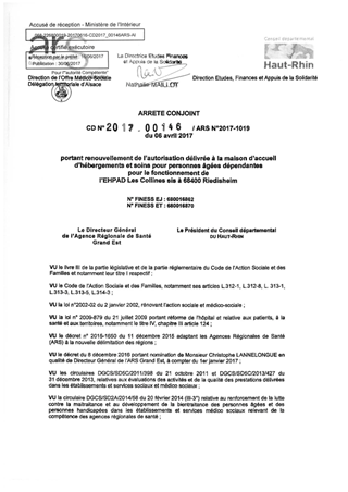 portant renouvellement de l'autorisation délivrée à la maison d'accueil d'hébergements et soins pour personnes âgées dépendantes pour le fonctionnement de l'EHPAD Les Collines sis à 68400 RIEDISHEIM Resumé Pièces jointes ARRETE Assemblée : Non défini Date : 06/04/2017 Rapporteur : Non défini Collectivité : Conseil départemental du Haut-Rhin Direction : Non défini Service : Direction de la Solidarité Domaine : Personnes Agées Commission :
