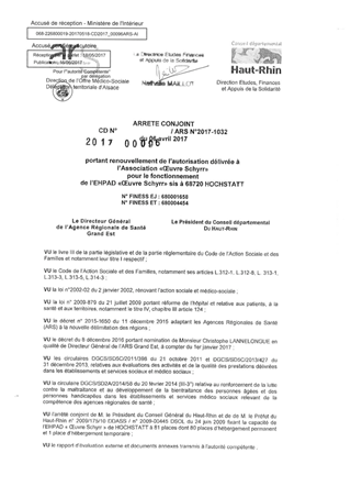 portant renouvellement de l'autorisation délivrée à l'association "Oeuvre Schyrr" pour le fonctionnement de l'EHPAD "Oeuvre Schyrr" sis à 68720 HOCHSTATT Resumé Pièces jointes ARRETE Assemblée : Non défini Date : 06/04/2017 Rapporteur : Non défini Collectivité : Conseil départemental du Haut-Rhin Direction : Non défini Service : Direction de la Solidarité Domaine : Autres (non classés) Commission :