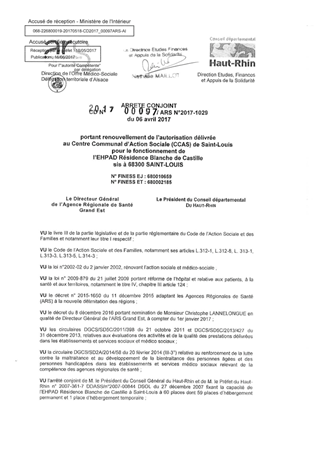portant renouvellement de l'autorisation délivrée au Centre Communal d'Action Sociale (CCAS) de SAINT-LOUIS pour le fonctionnement de l'EHPAD résidence Blance de Castille sis à 68300 SAINT-LOUIS Resumé Pièces jointes ARRETE Assemblée : Non défini Date : 06/04/2017 Rapporteur : Non défini Collectivité : Conseil départemental du Haut-Rhin Direction : Non défini Service : Direction de la Solidarité Domaine : Autres (non classés) Commission :