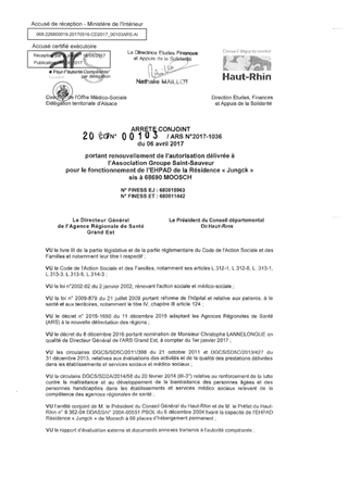 portant renouvellement de l'autorisation délivrée à l'association "Groupe Saint-Sauveur" pour le fonctionnement de l'EHPAD de la résidence "Jungck" sis à 68690 MOOSCH Resumé Pièces jointes ARRETE Assemblée : Non défini Date : 06/04/2017 Rapporteur : Non défini Collectivité : Conseil départemental du Haut-Rhin Direction : Non défini Service : Direction de la Solidarité Domaine : Autres (non classés) Commission :